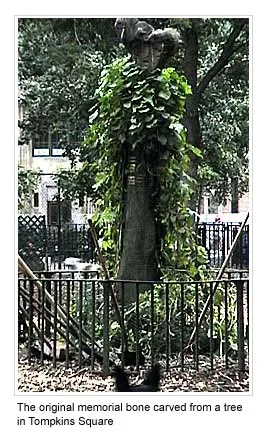 "The Bone" first appeared in Tompkins Square park when an old tree died in the center of the dog run. It was shaped into a bone by a local chainsaw artist. Folks began attaching their tags and flowers upon it when their beloved pet passed away.
